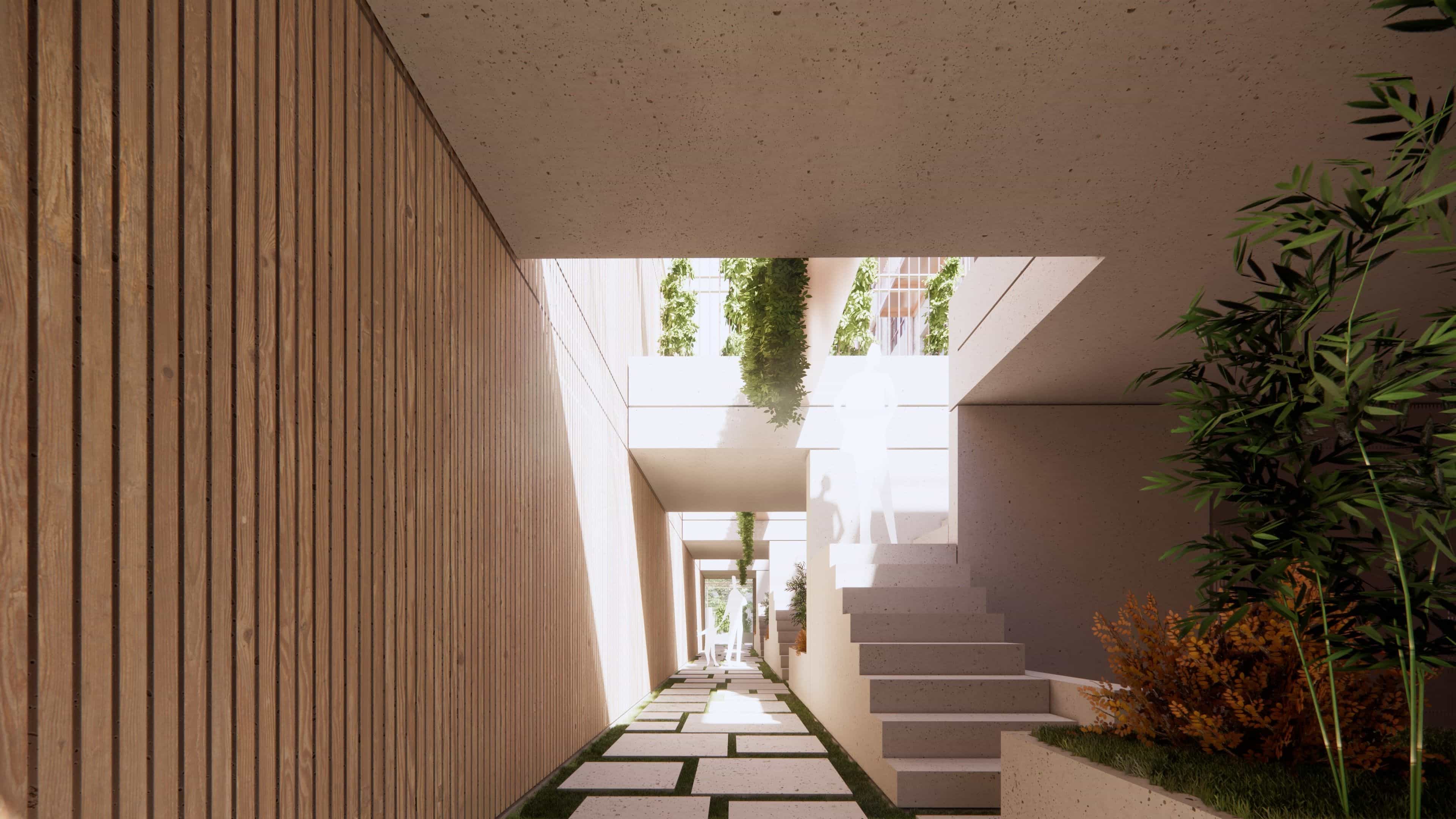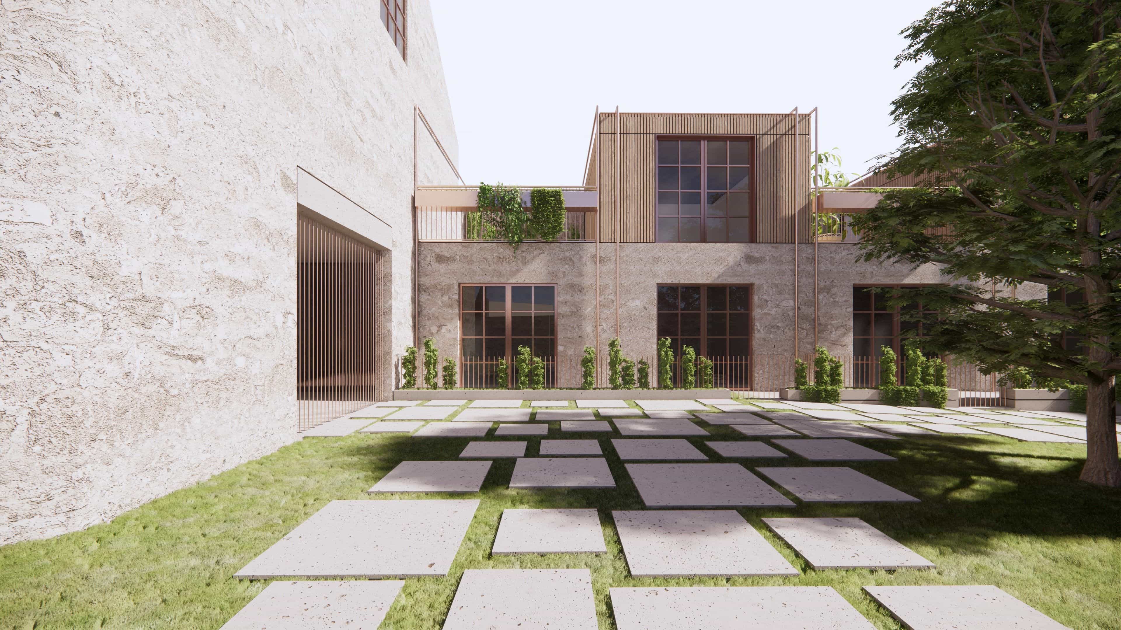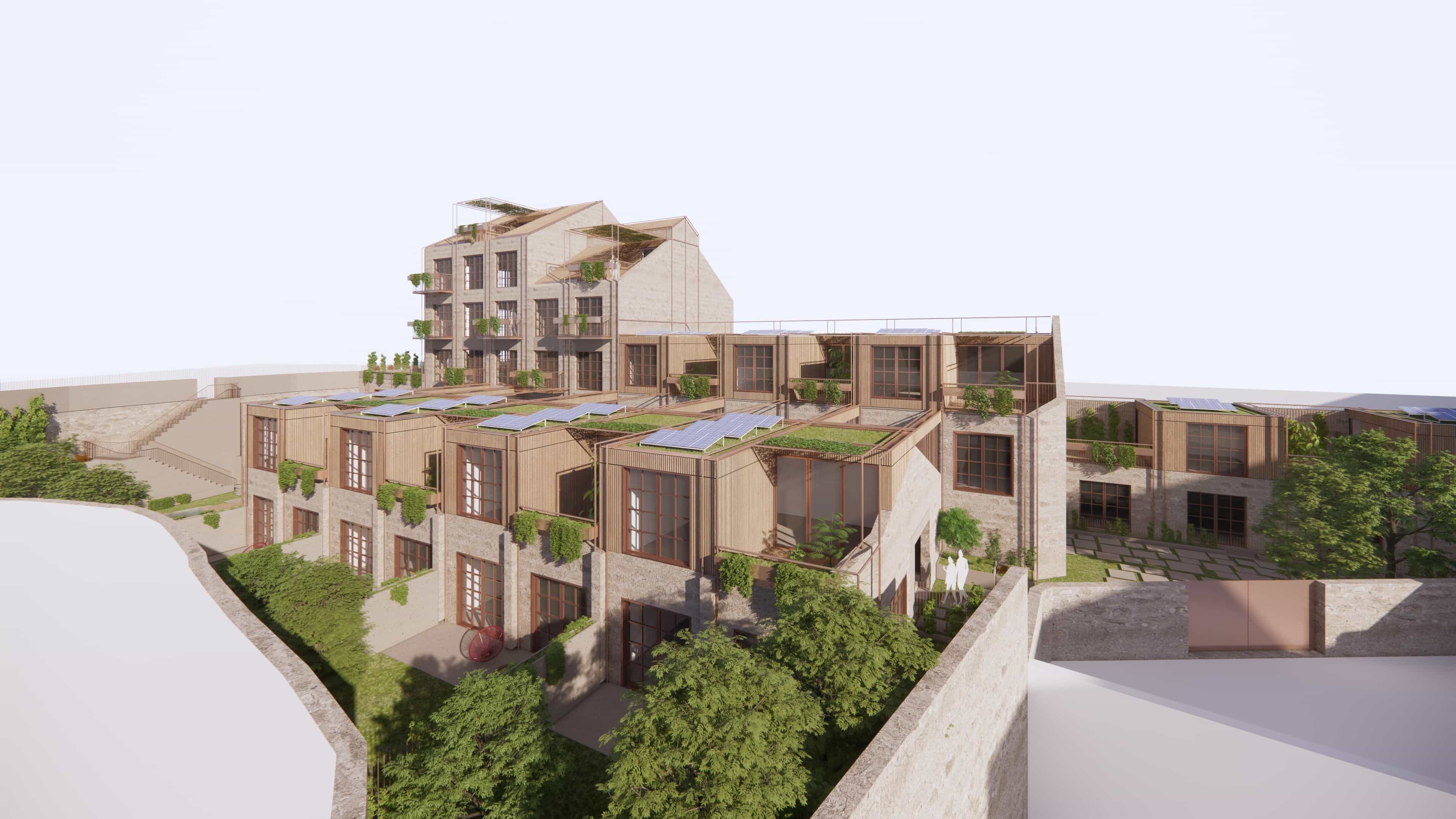 By retaining the essence of the original structure, we repurpose its raw materials to integrate modern comforts seamlessly into the fabric of the past, keeping the stone as the outer surface and insulating walls with cork blocks from the inside. With a focus on community, our design incorporates shared access points and inviting patios, fostering a sense of belonging among residents. Add–ons, crafted from thermally modified wood and recycled steel, pay homage to the factory's heritage while enhancing its functionality for contemporary living. Patios and gardens intertwine throughout the space, infusing natural light and ventilation, solar gains, warmth, and lush greenery into each apartment.