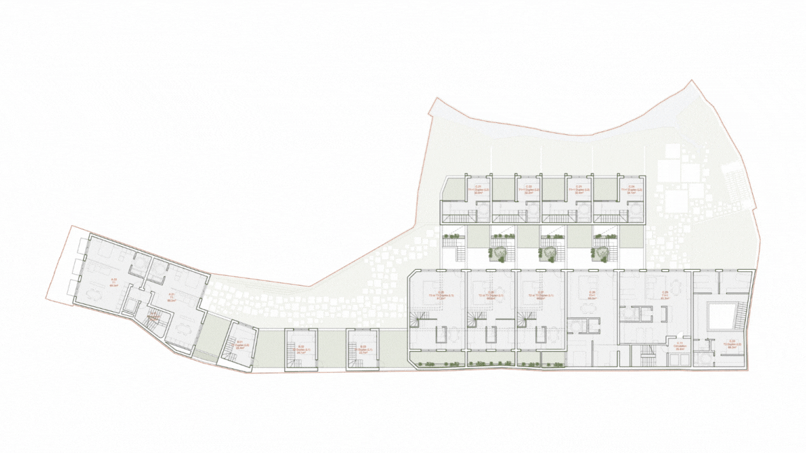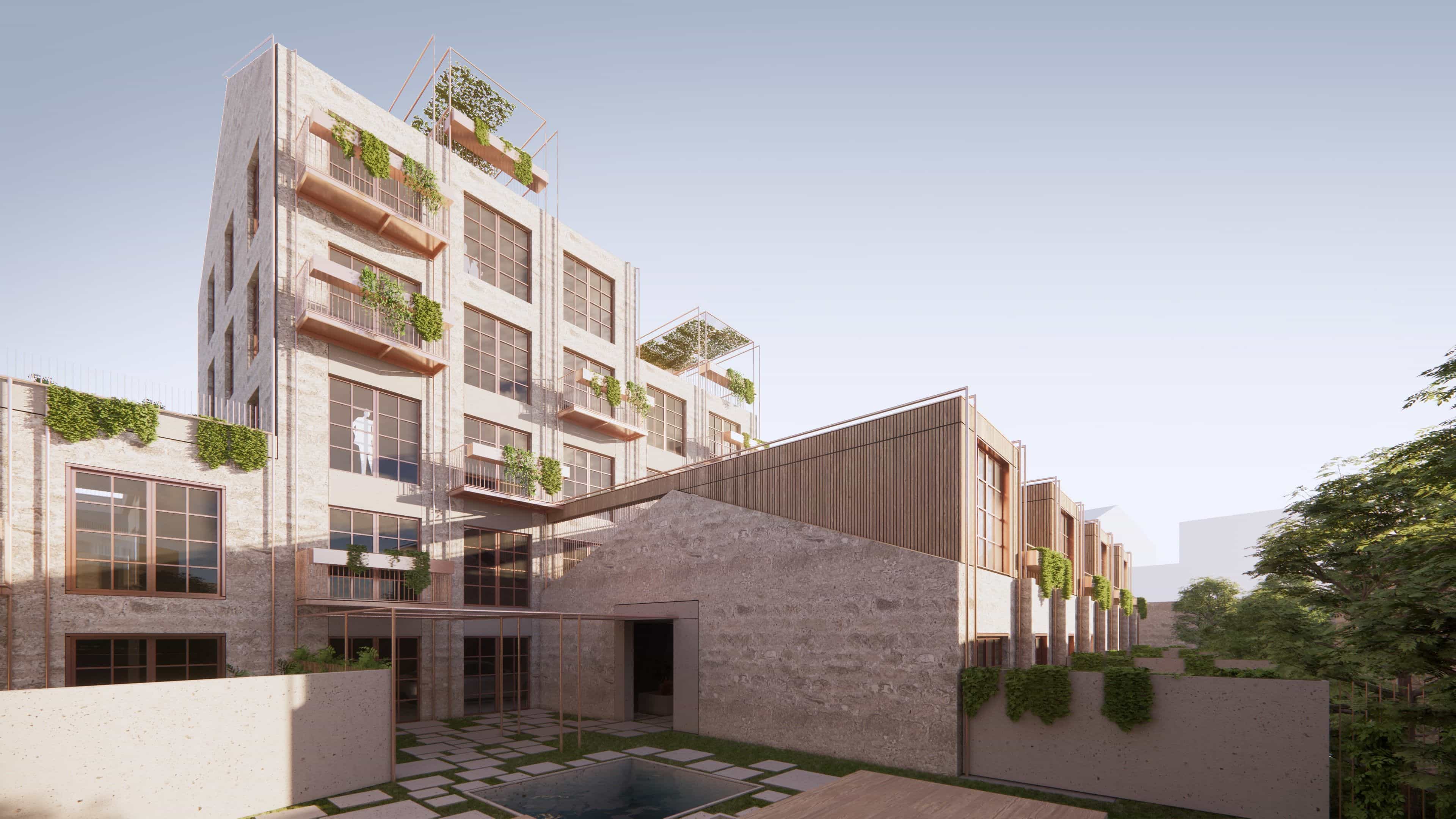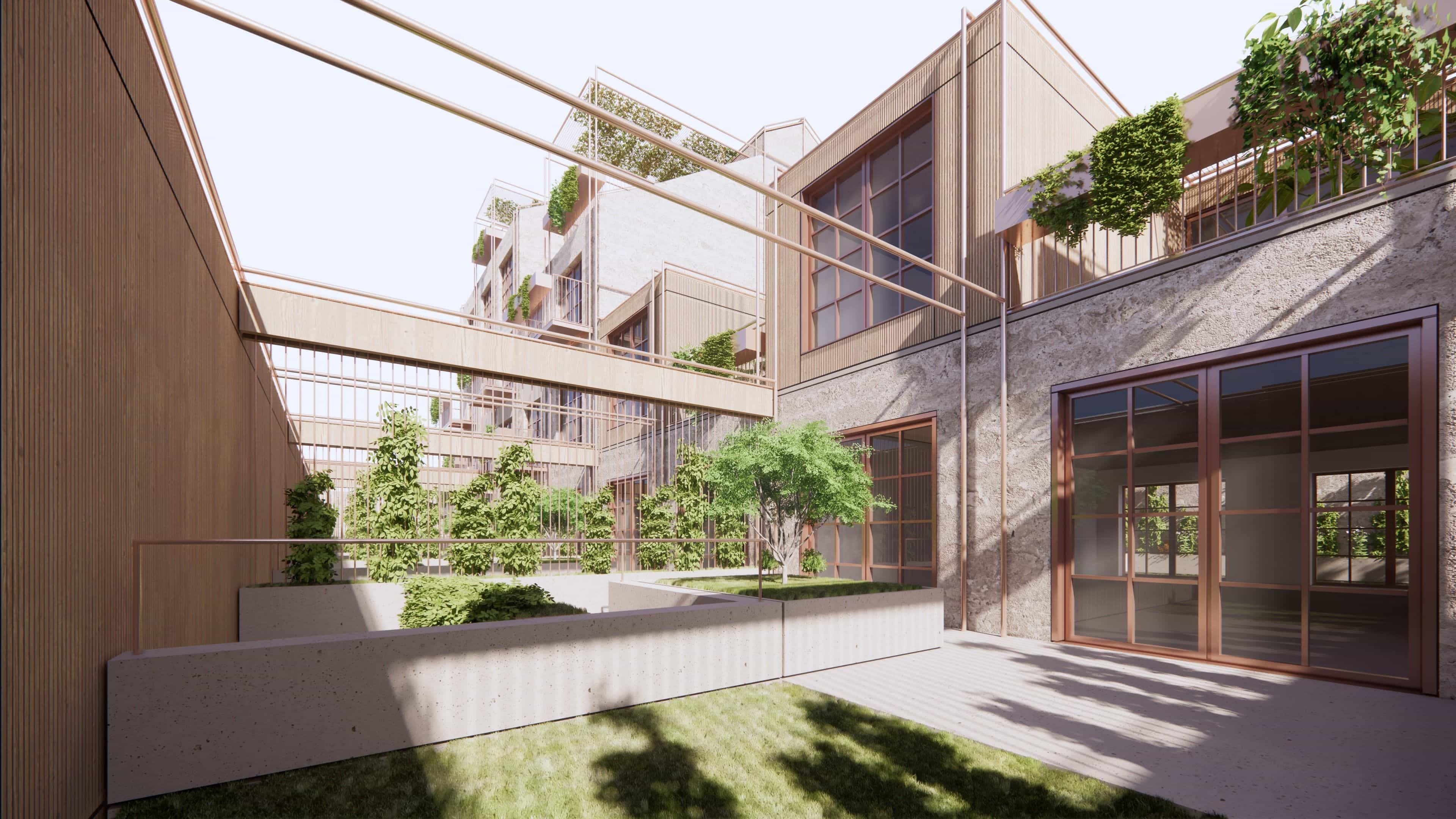 By retaining the essence of the original structure, we repurpose its raw materials to integrate modern comforts seamlessly into the fabric of the past, keeping the stone as the outer surface and insulating walls with cork blocks from the inside. With a focus on community, our design incorporates shared access points and inviting patios, fostering a sense of belonging among residents. Add–ons, crafted from thermally modified wood and recycled steel, pay homage to the factory's heritage while enhancing its functionality for contemporary living. Patios and gardens intertwine throughout the space, infusing natural light and ventilation, solar gains, warmth, and lush greenery into each apartment.