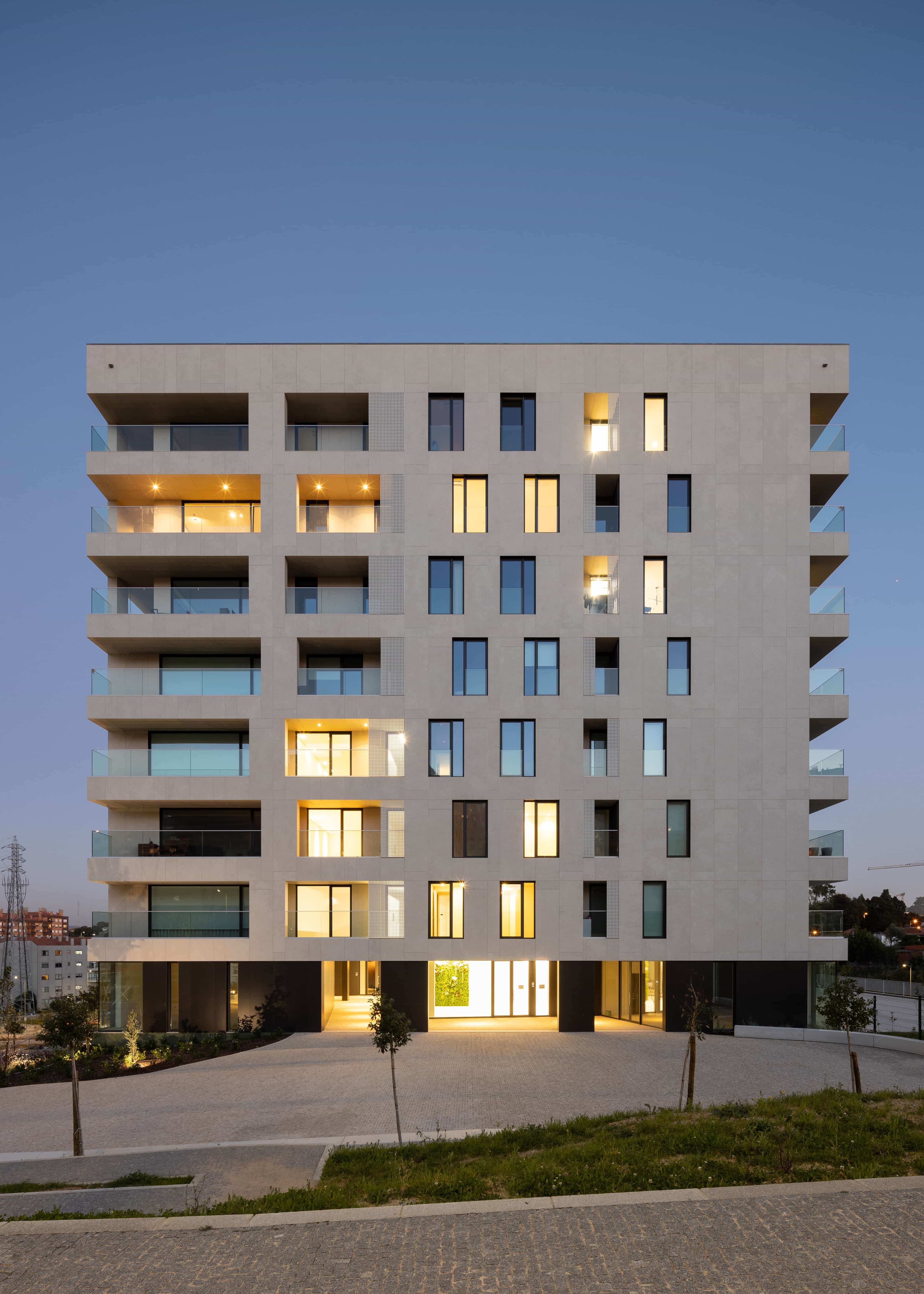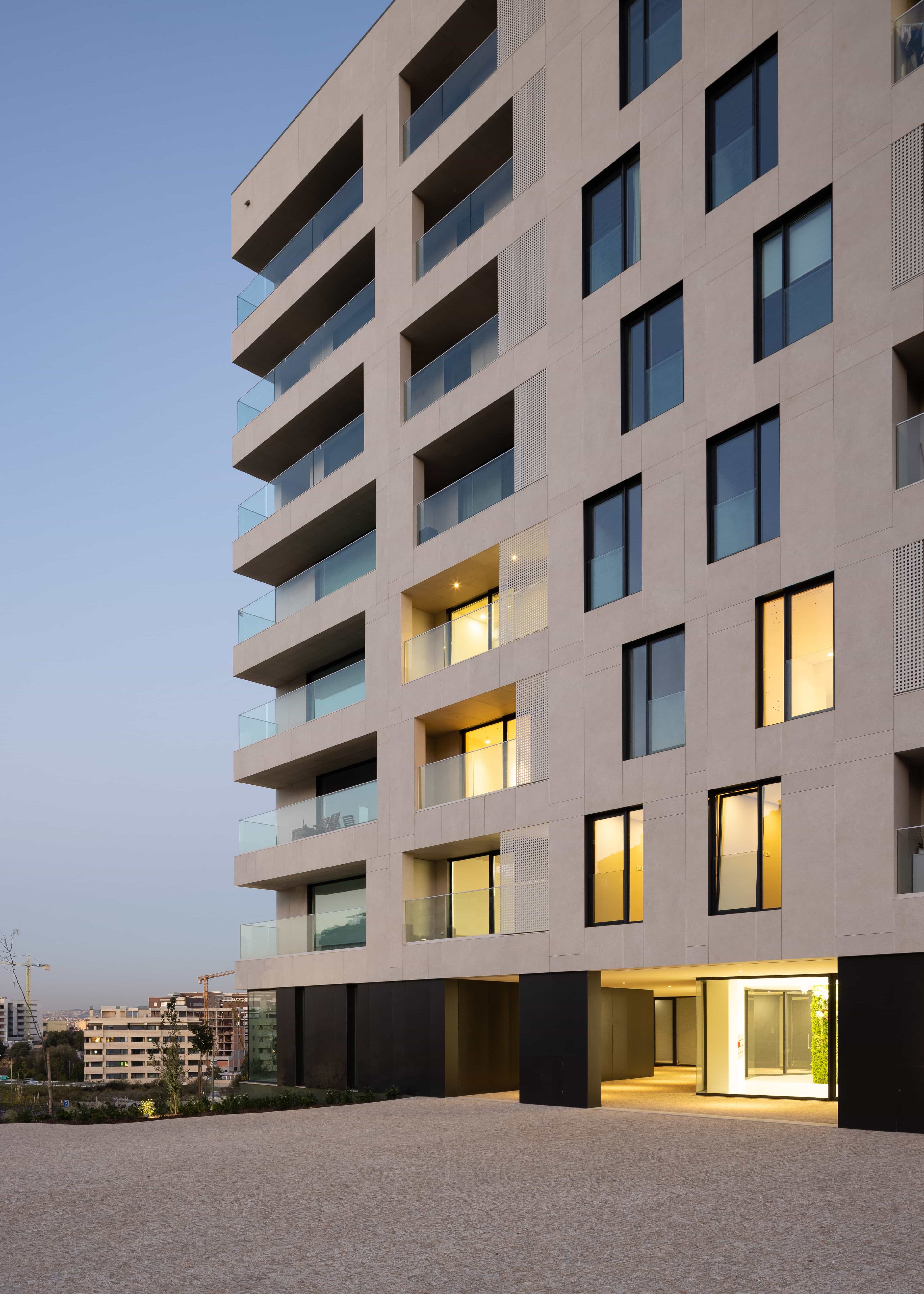 One of the key design elements is the careful positioning of balconies as a setback in the corners of the building. This intentional placement serves a dual purpose. Firstly, it ensures the residents' comfort by protecting the balconies from overheating, thus creating inviting outdoor spaces. Secondly, it adds an aesthetic appeal to the façade, breaking the monolithic look and offering a dynamic interplay of light and shadow.