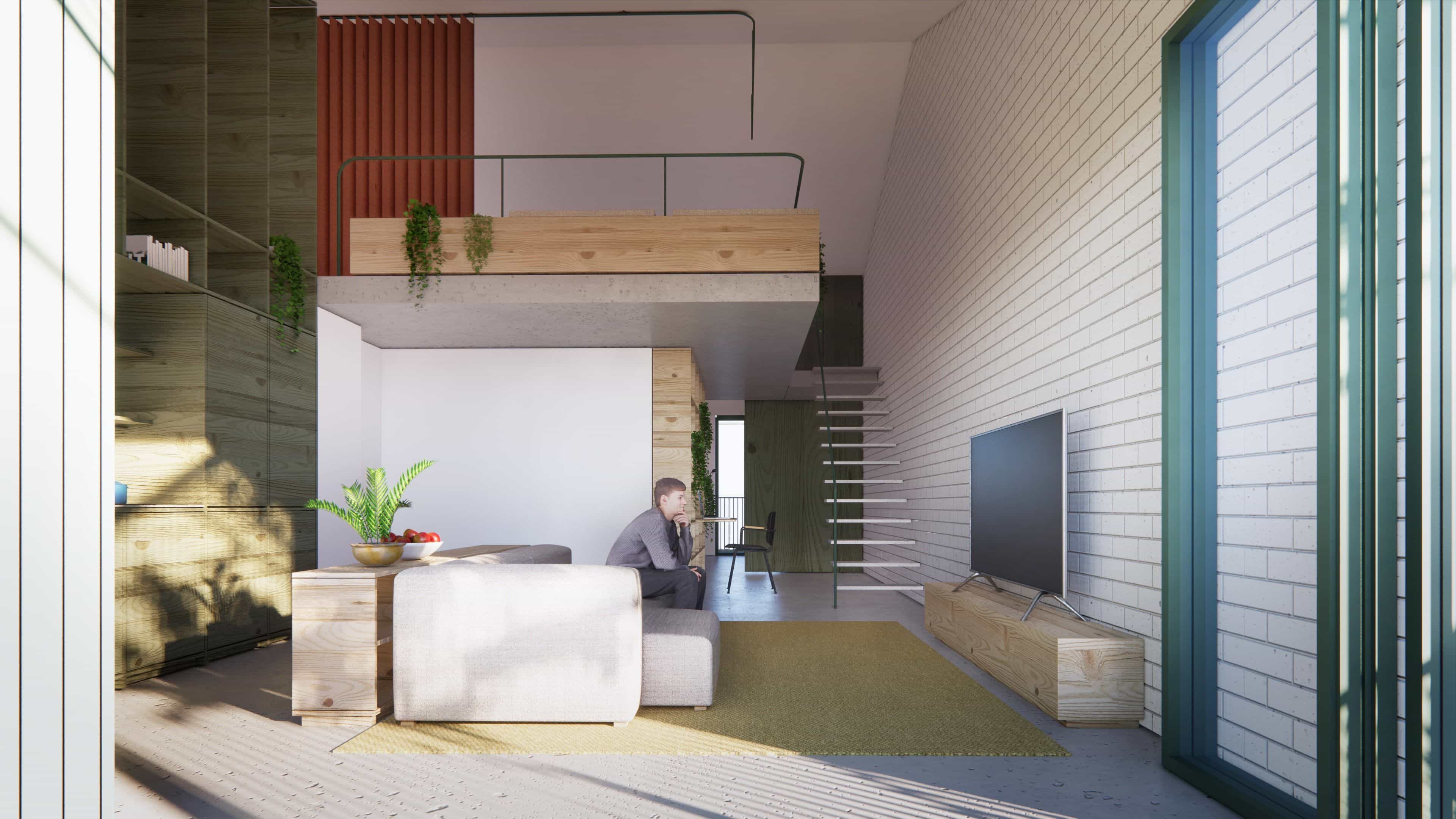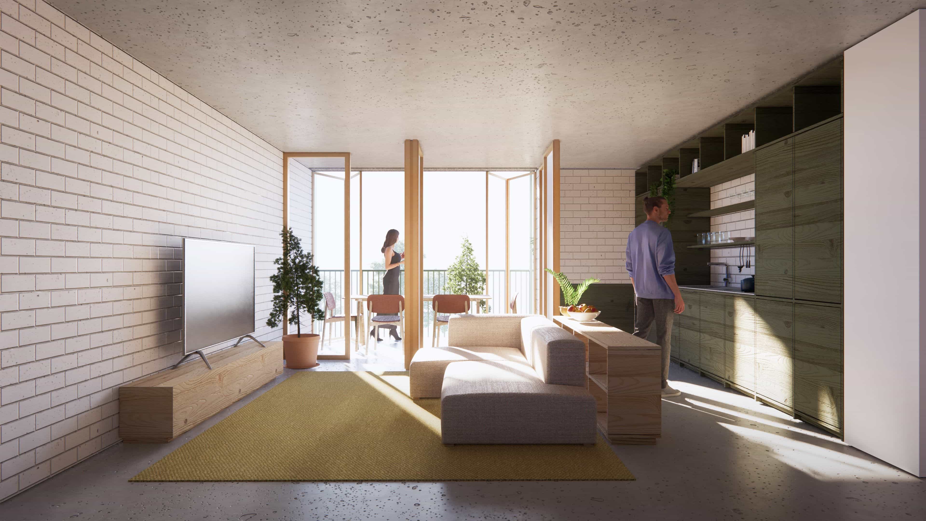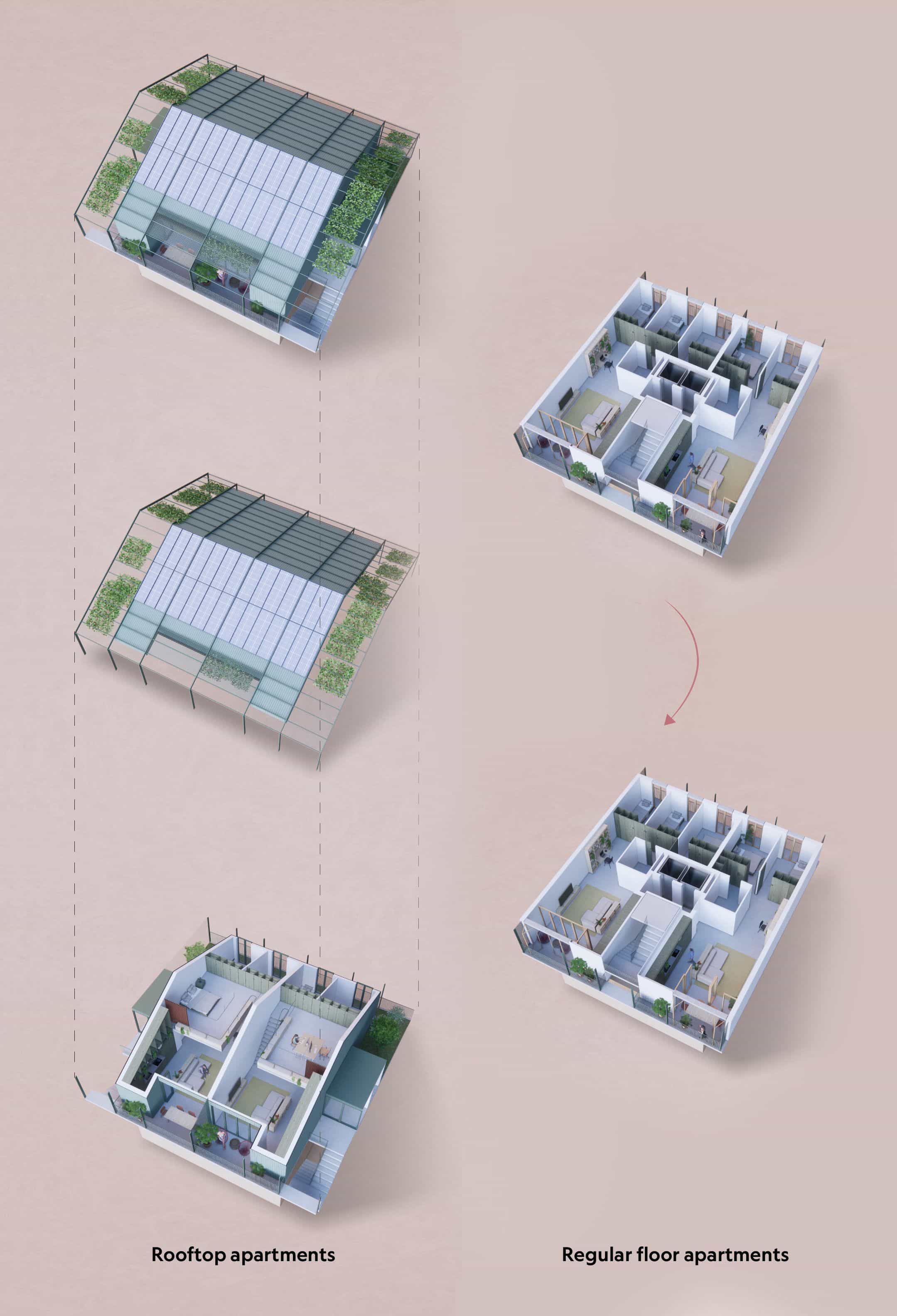 Additionally, the roof geometry results from the multiplication of the apartments below, with the addition of one mezzanine to turn a 2–bedroom apartment into a 3–bedroom unit. The project also incorporates passive design strategies, maximizing solar gains, providing ample daylight exposure, and natural cross ventilation. The apartments feature access to gracious balconies and winter gardens that function as thermal buffers, keeping the apartments warm in winter and blocking sun rays from the windows in summer.