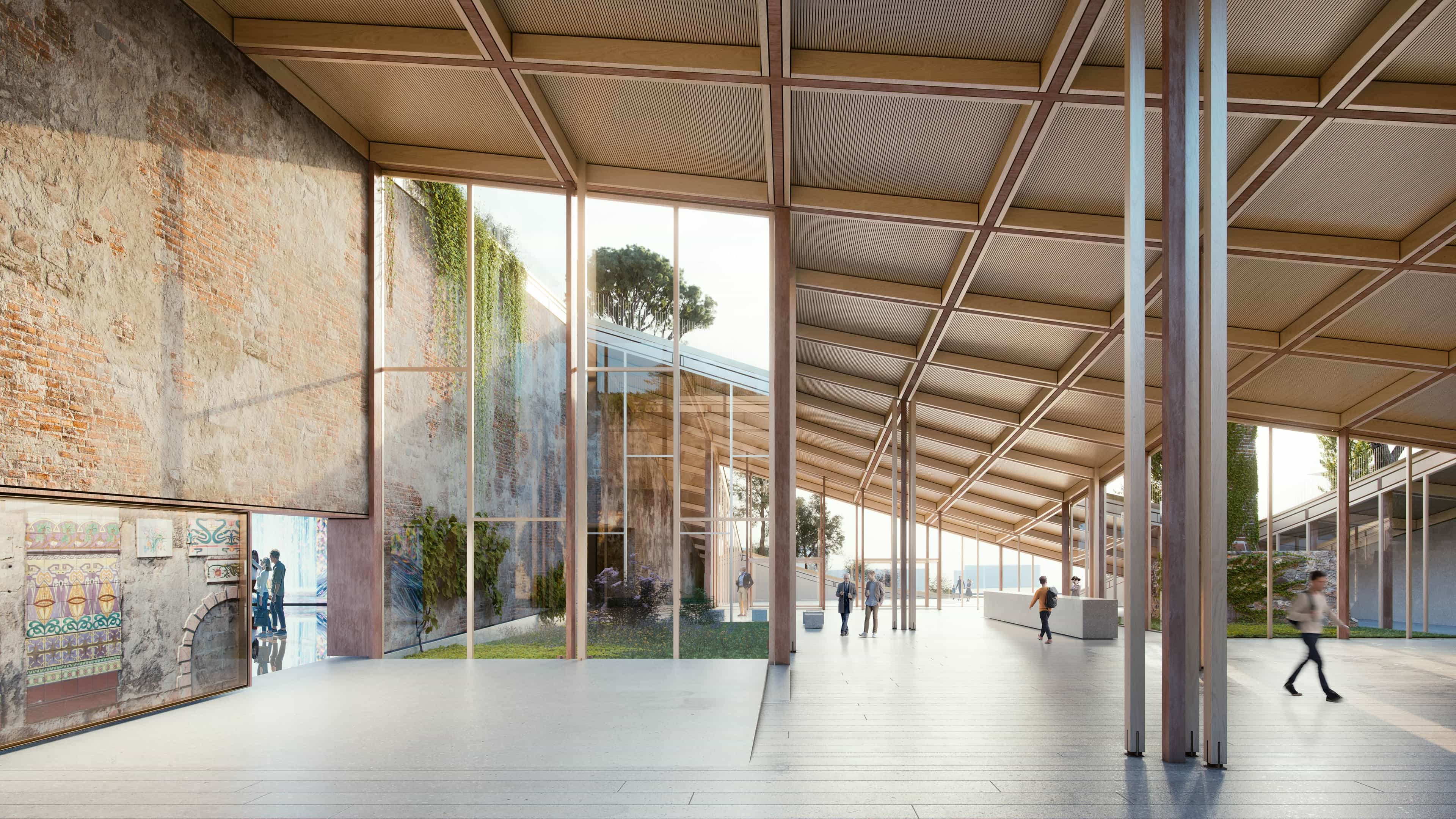 The proposal envisages a green veil being created over the entire plot, offering a qualified public space for the local community and the stage for the new museum. This space shares with the city all it's potential in its different uses and occupations. Throughout the park, one will find the reminiscences of the existing structures, monuments, and ruins of the old ceramic production halls. These can be contemplated from above: the old chimneys and furnaces become integrated within the park and museum. The roof becomes a topography and accessible for everyone. Museums require an admission fee, and only a few will visit its content. But not in this one: the museum is seen from inside out here.