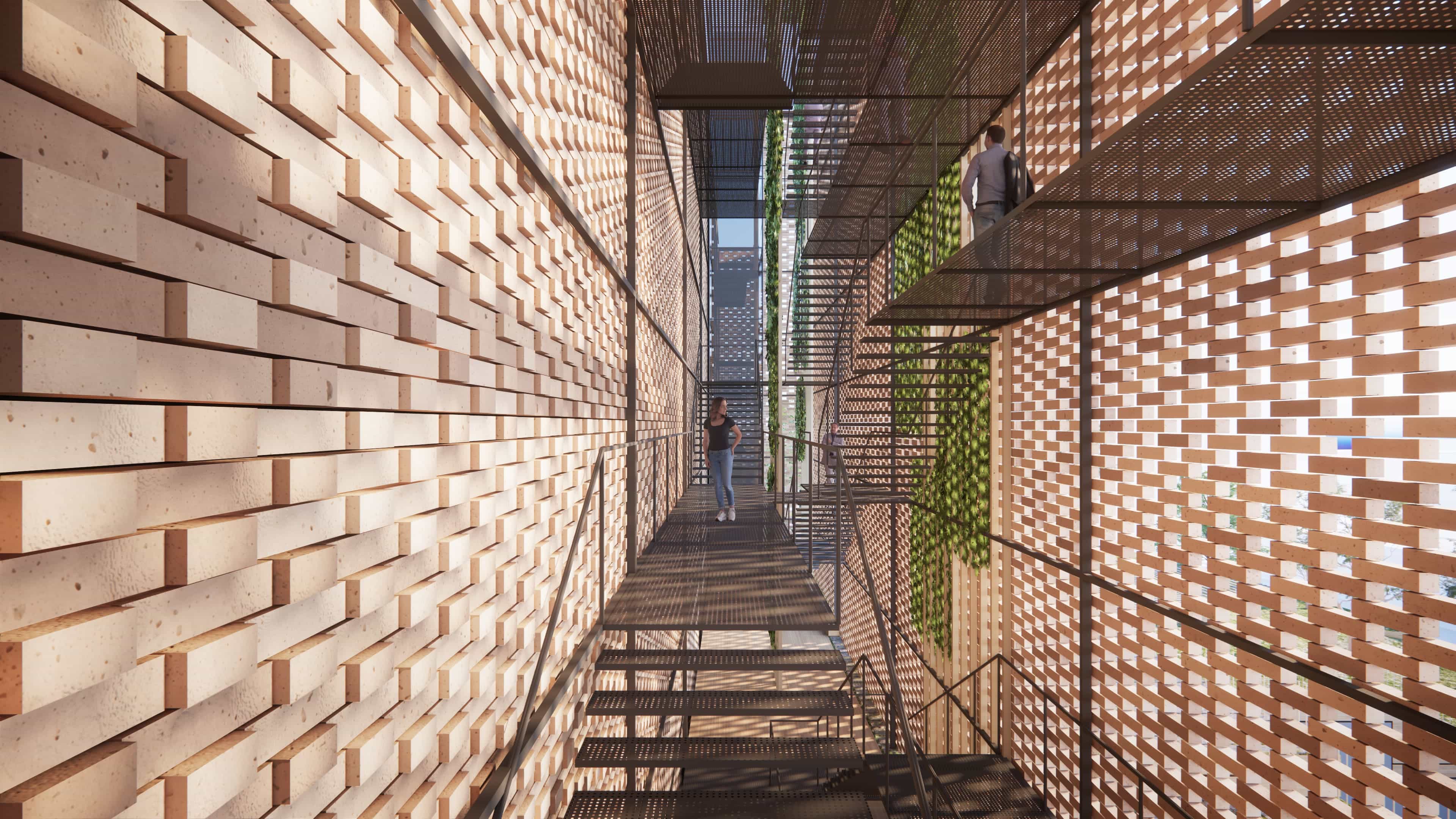 Pedestrian access is deliberately planned, mainly through the South/North axis, which celebrates the connection between the Loures City Hall building and its future urban park. The southern access is located at street level and develops through a staircase leading to the main lobby. This journey compels us to a more controlled and dedicated sensory dimension aligned with the building's program. Gradually, the path distances us from the city noise and gently absorbs all our attention for performative and cultural enjoyment.