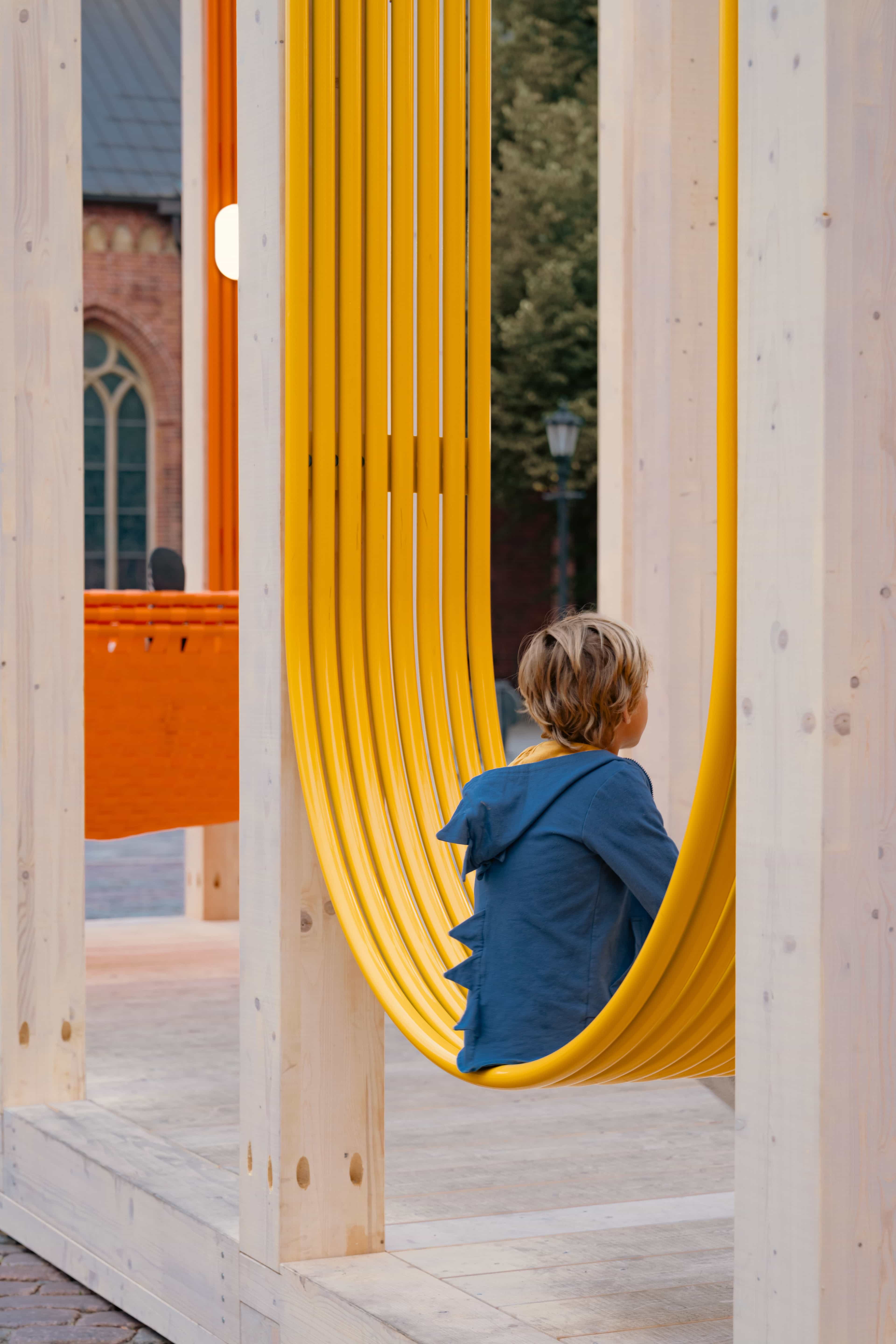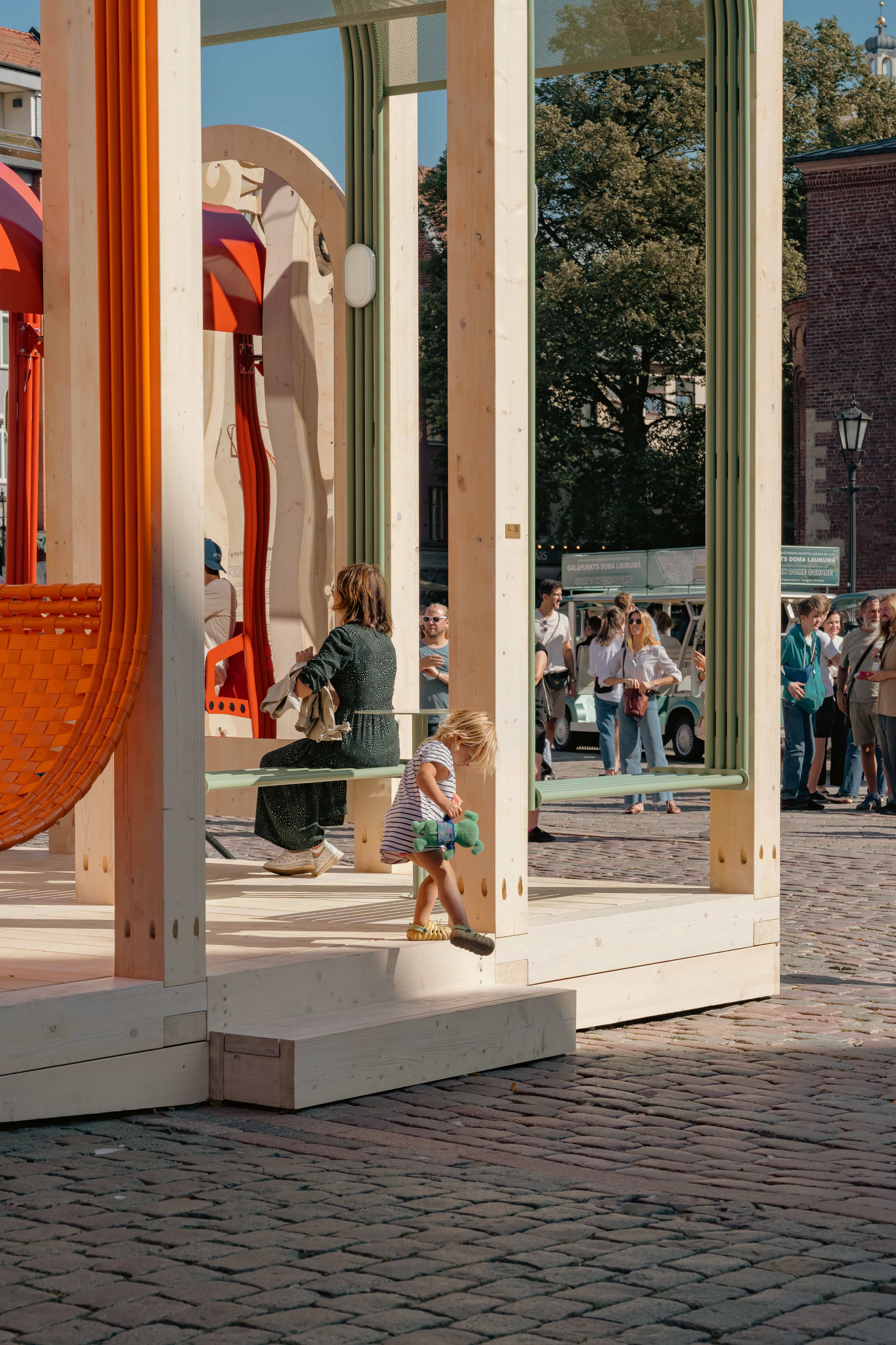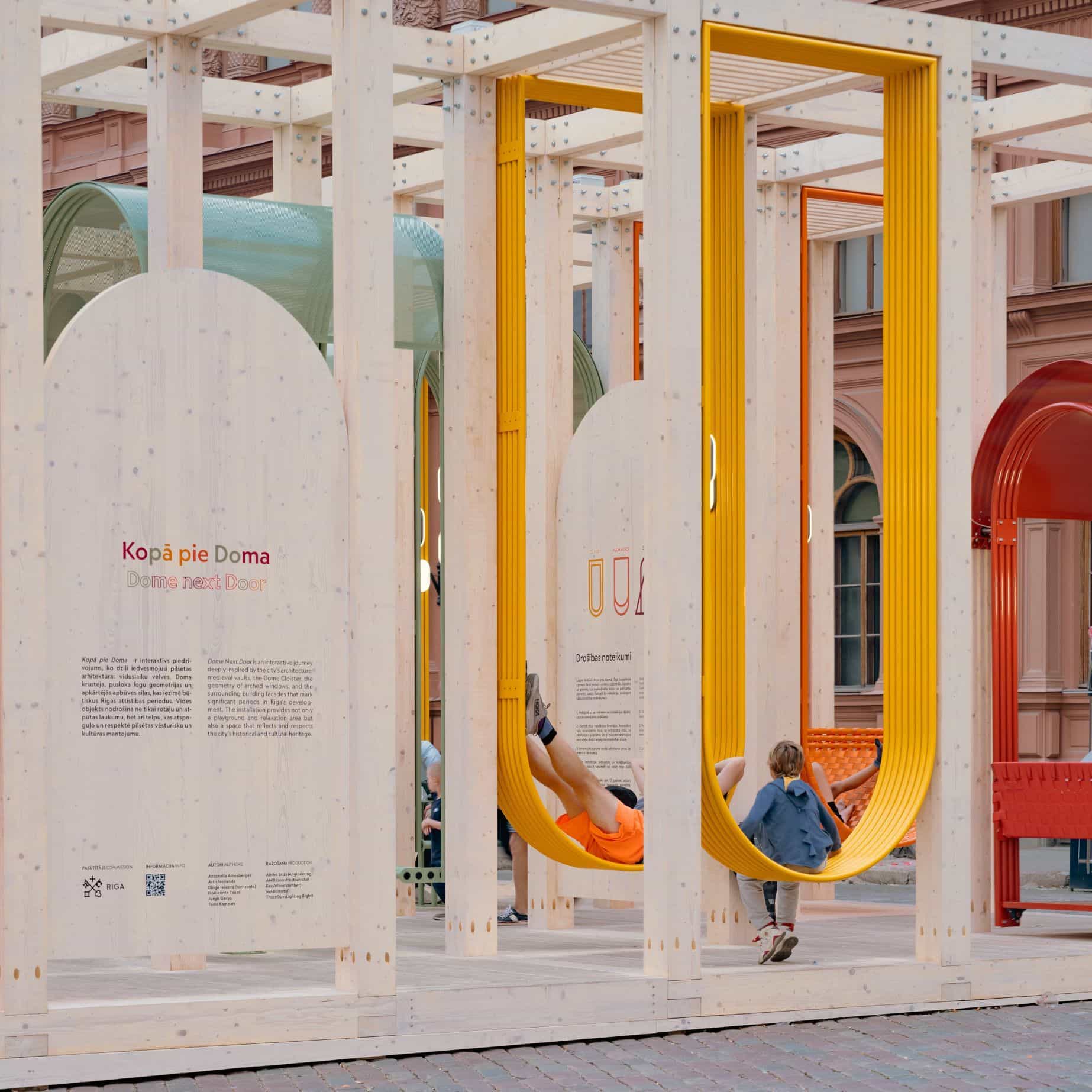 Dome Next Door is a summer urban art installation transforming Riga’s Cathedral Square into a vibrant hub of social interaction and cultural reflection. Running from July to September, the project addresses the square’s lack of a central gathering point by introducing a multisensory structure inspired by the city's historic architecture. The installation consists of four colourful modules—each designed for leisure, play, and community engagement—featuring swings, hammocks, seating areas, and rain shelters. Sustainability is central to the concept, using eco–friendly materials like timber Glulam's and steel, along with solar panels for energy self–sufficiency. Designed for disassembly and reuse, the structure can be relocated or upcycled after the event. Dome Next Door blends aesthetic appeal with environmental and social responsibility, creating a playful, inclusive, and dynamic public space rooted in Riga’s cultural heritage.