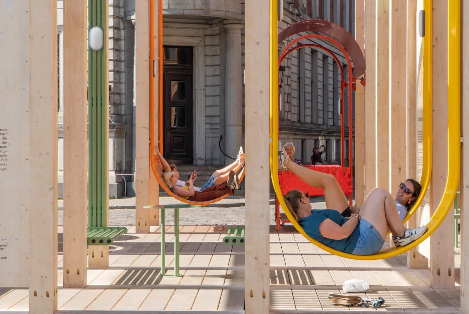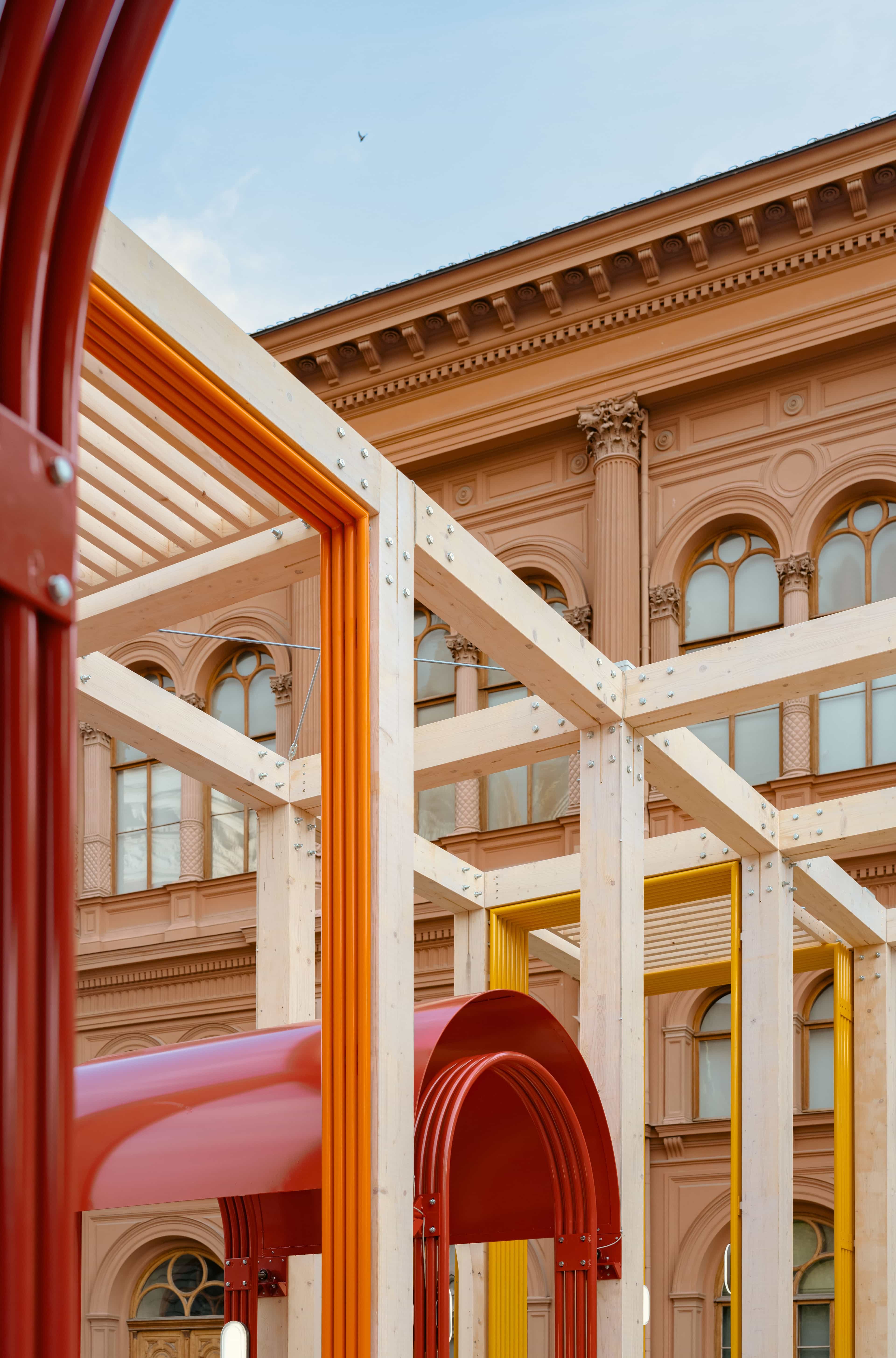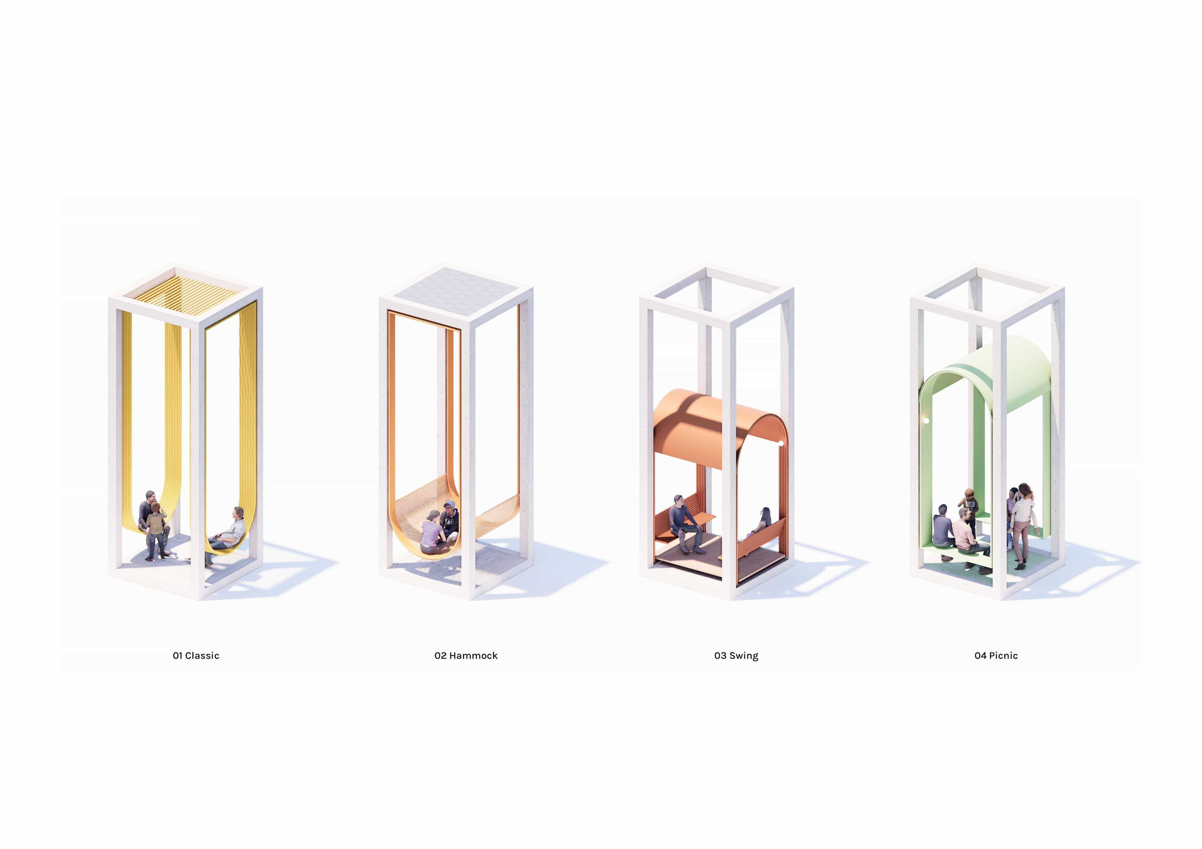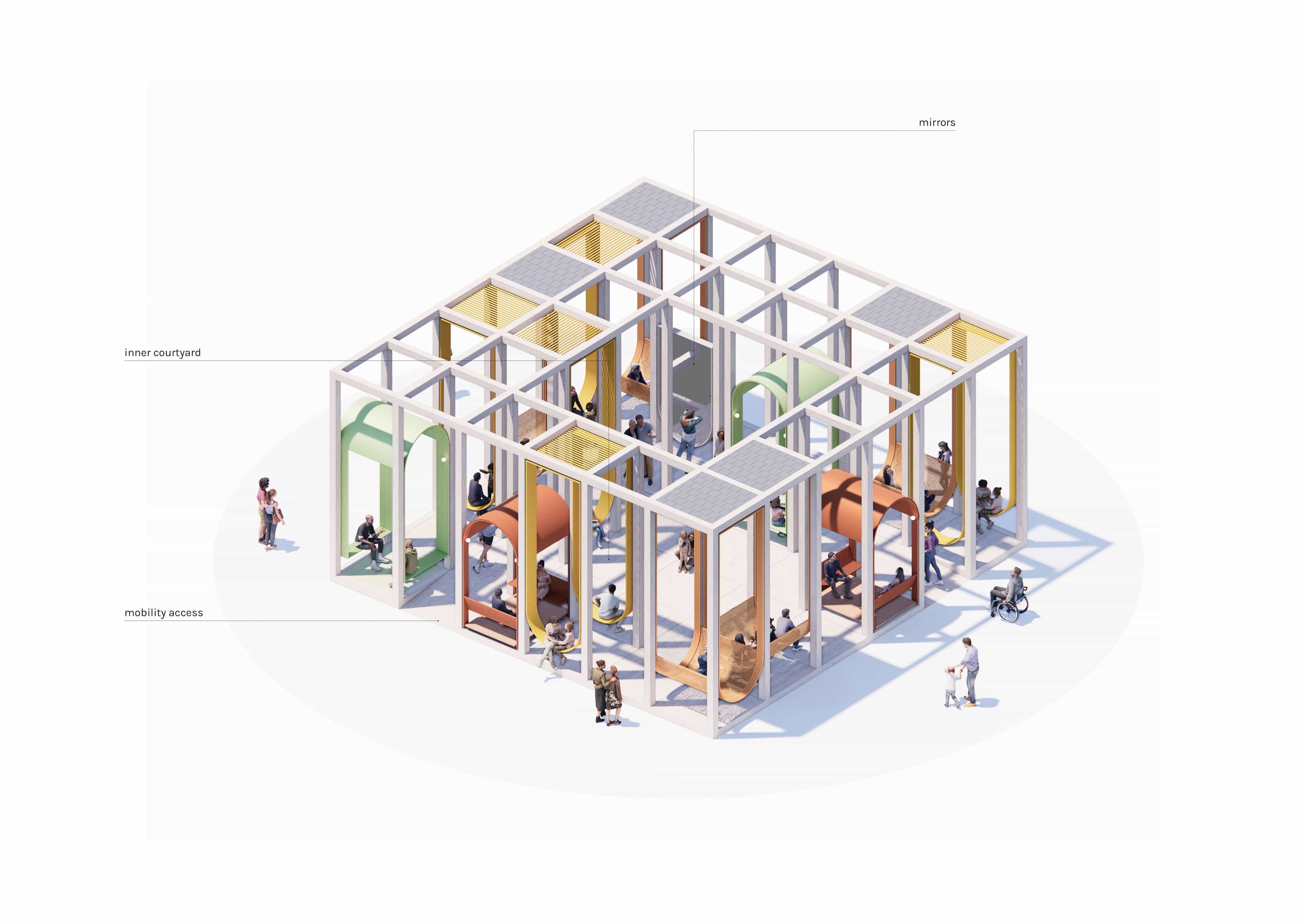 Dome Next Door is a summer urban art installation transforming Riga’s Cathedral Square into a vibrant hub of social interaction and cultural reflection. Running from July to September, the project addresses the square’s lack of a central gathering point by introducing a multisensory structure inspired by the city's historic architecture. The installation consists of four colourful modules—each designed for leisure, play, and community engagement—featuring swings, hammocks, seating areas, and rain shelters. Sustainability is central to the concept, using eco–friendly materials like timber Glulam's and steel, along with solar panels for energy self–sufficiency. Designed for disassembly and reuse, the structure can be relocated or upcycled after the event. Dome Next Door blends aesthetic appeal with environmental and social responsibility, creating a playful, inclusive, and dynamic public space rooted in Riga’s cultural heritage.