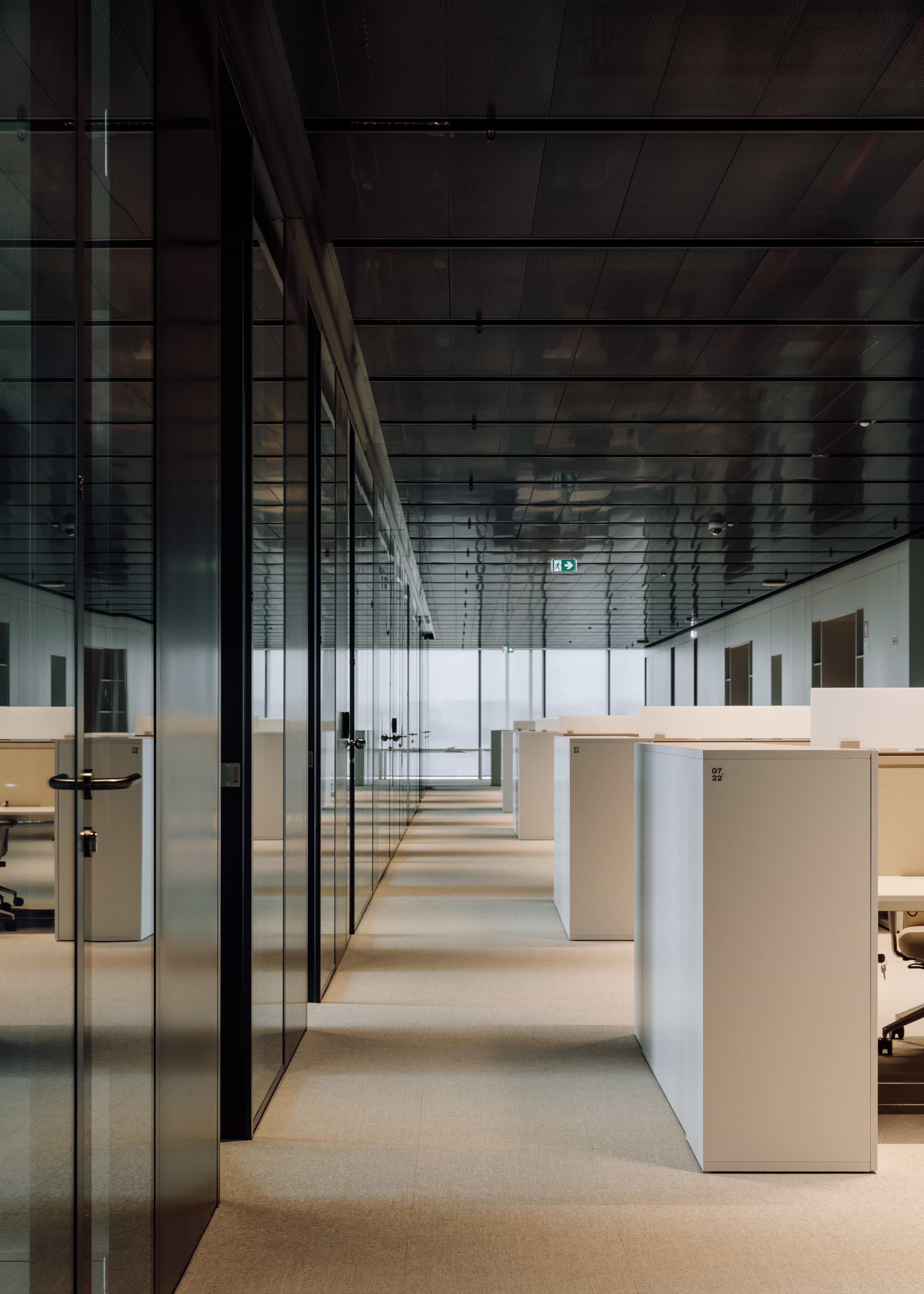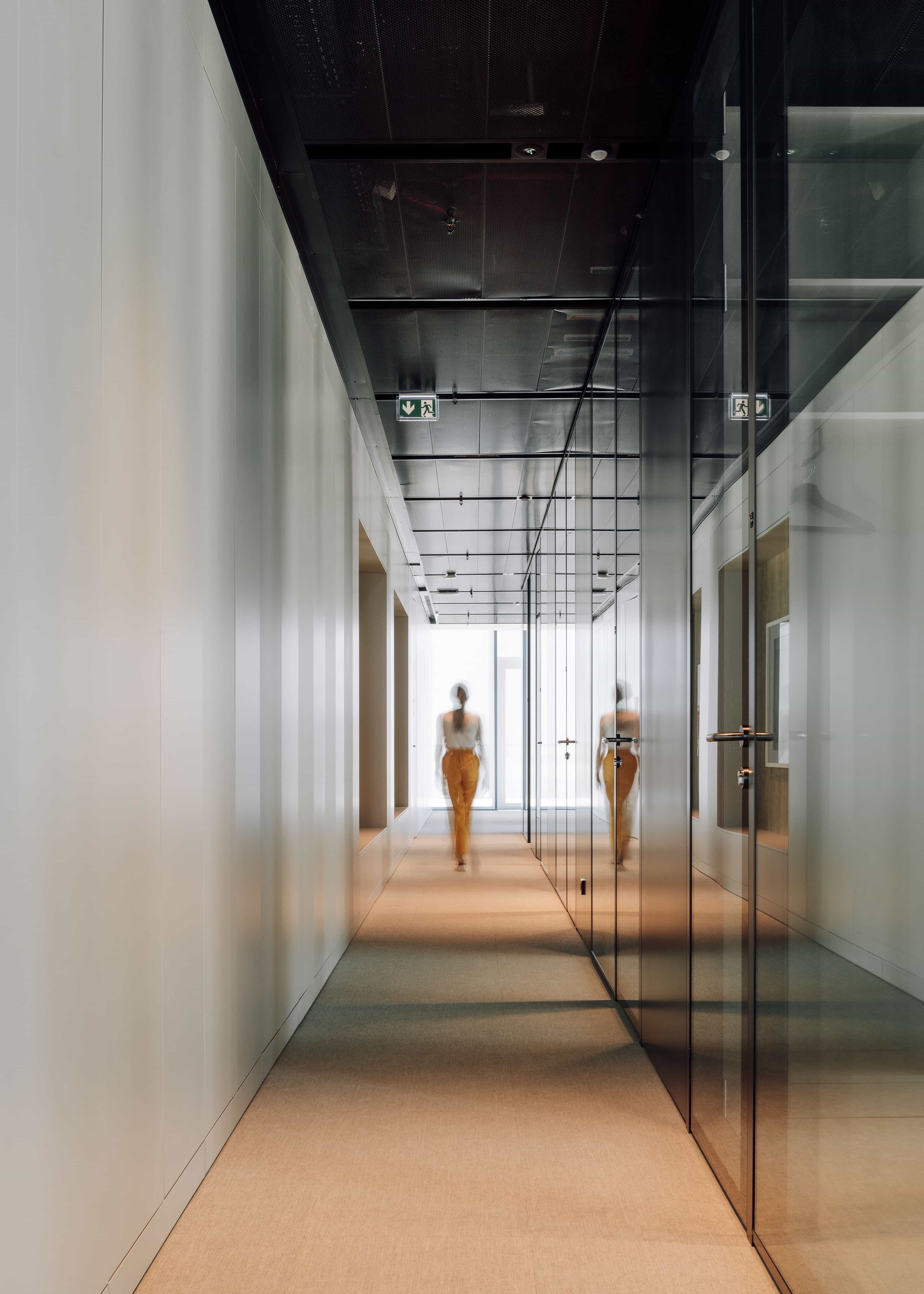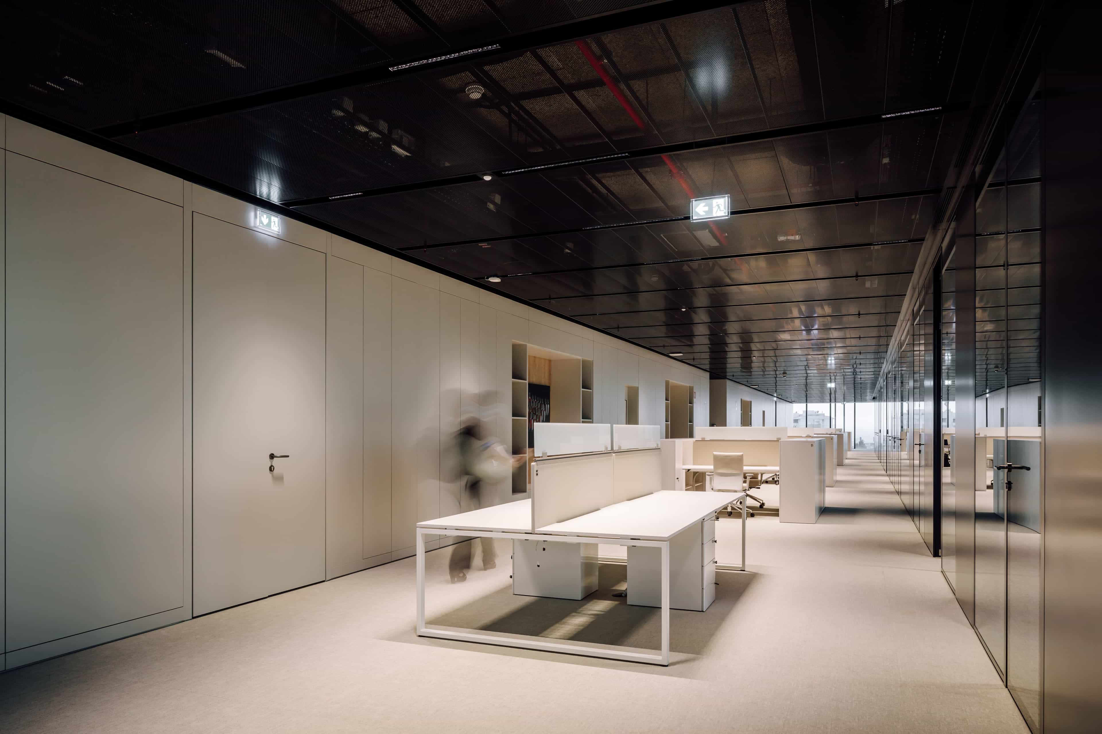 To amplify the relationship between indoors and outdoors and dwindle the borders between office rooms and open space areas, we paid particular attention to the spatial distribution and partition walls made of glass and minimal profiles. The space was carefully designed to maximise the daylight factor conditions to every working spot. Closer to the façade, the office rooms will admit longer working hours, while the open space is used for more collaborative and temporary tasks and gatherings.
