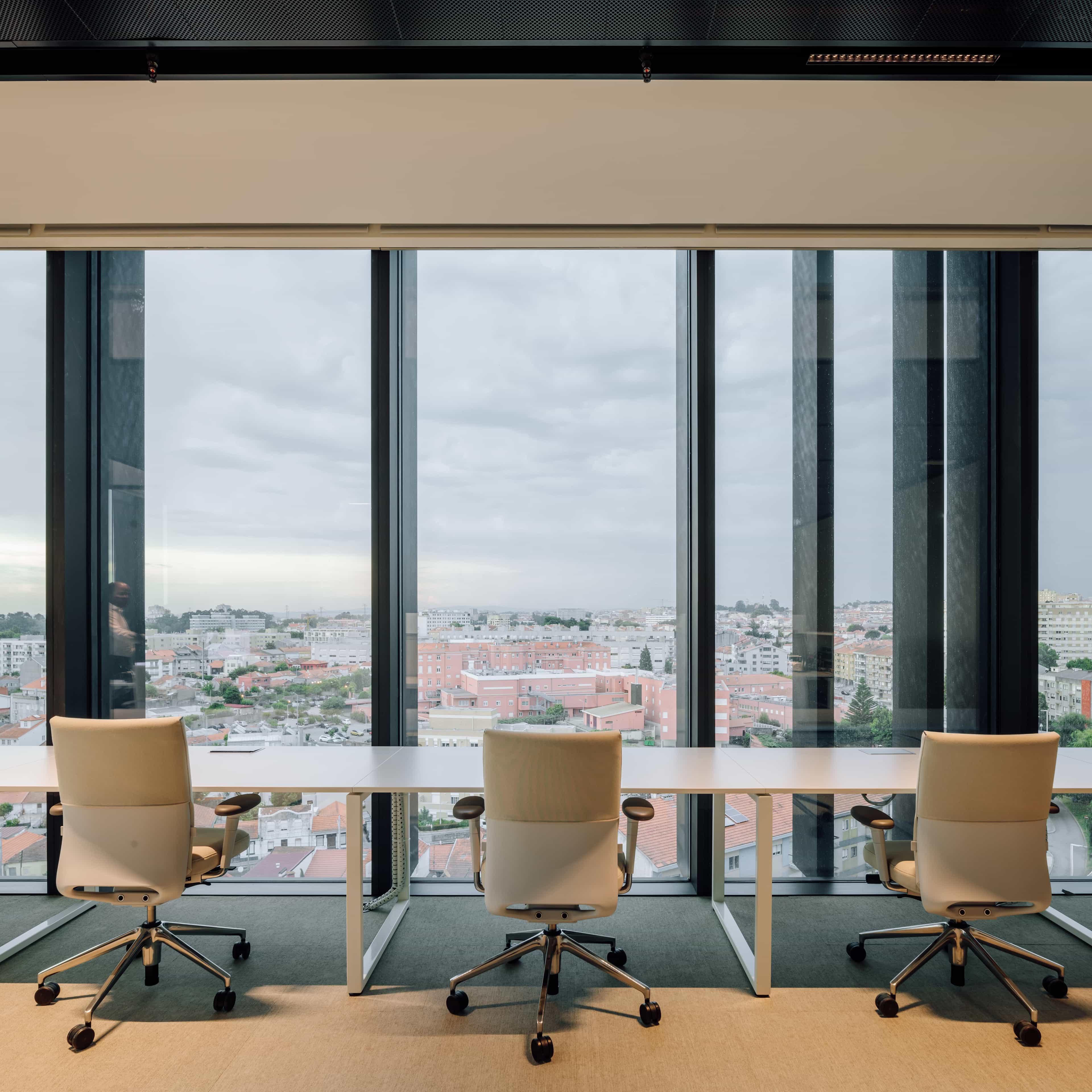 Located in Porto’s business area and with 1600 square meters distributed over the 2 top floors of Porto Office Park, the offices have a 360º view over the city. Together with *design factory, we designed an open–floor concept where every employee can cherish the outstanding view from their working station.