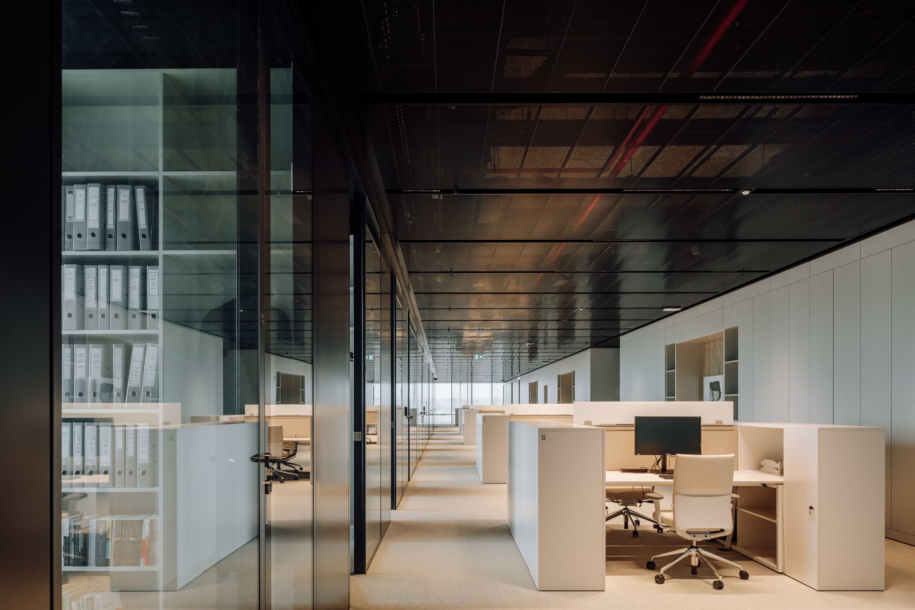 We applied a ruling metric that follows the façade rhythm, defining each enclosed compartment, yet leaving room for a flexible adaptation in the future. Hence the ceiling comprises a perforated metal sheet that recalls the building's industrial look.